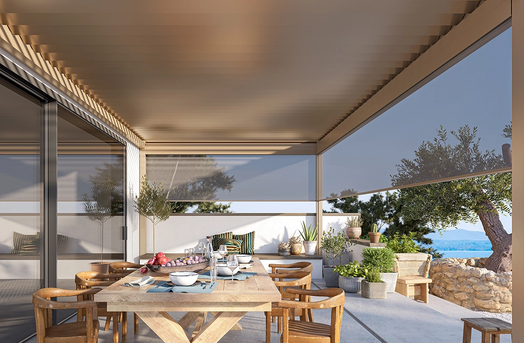 - Integrierter ZIP-Screen: Sorgt für zusätzliche Beschattung und erhöht den Komfort in Ihrem Außenbereich, ohne die Ästhetik zu beeinträchtigen. Diese Option ist perfekt geeignet, um Blendung zu reduzieren und gleichzeitig die Sicht nach außen zu erhalten.